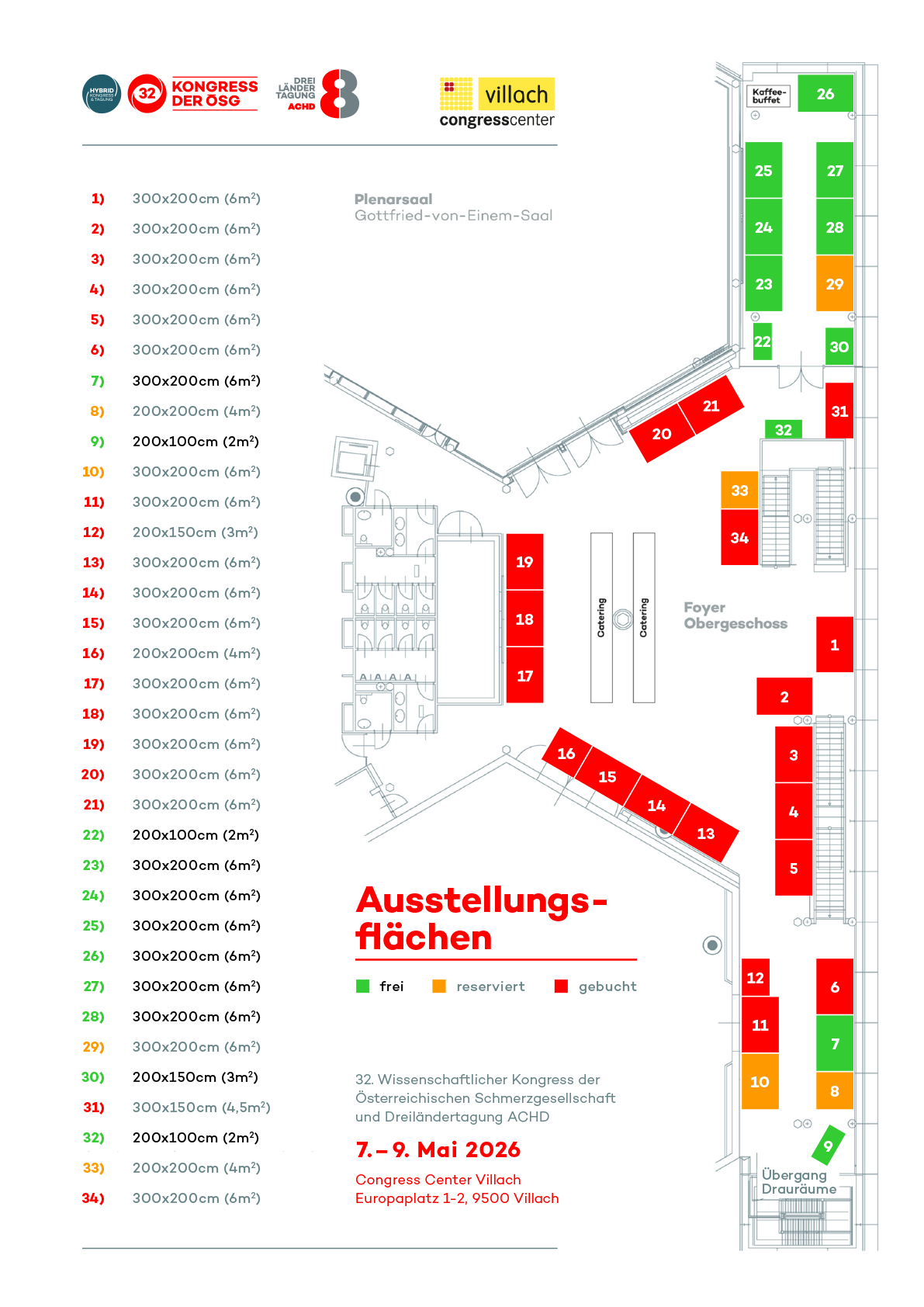 Kongress-/Tagungsort, -termin: 32. Kongress der Österreichischen Schmerzgesellschaft 7.–8. Mai 2026 (Hybrid-Kongress) Dreiländertagung ACHD 9. Mai 2026 (Hybrid-Tagung) Congress Center Villach Europaplatz 1-2 9500 Villach Kongress-Präsident:innen: Univ.-Prof. Dr. Richard Crevenna, MSc, MSc, MBA Vorstand der Universitätsklinik für Physikalische Medizin, Rehabilitation und Arbeitsmedizin Medizinische Universität Wien A-1090 Wien, Währinger Gürtel 18-20 T: +43 1 4040 043 330 E: richard.crevenna@meduniwien.ac.at Prim. Univ.-Prof. Dr. Rudolf Likar, MSc Klinikum Klagenfurt am Wörthersee Abt. für Anästhesie und Intensivmedizin A-9020 Klagenfurt, Feschnigstraße 11 T: +43 463 538 34303 E: rudolf.likar@kabeg.at OÄ Dr. Waltraud Stromer Landesklinikum Horn Abteilung für Anästhesiologie und Intensivmedizin A-3580 Horn, Spitalgasse 10 T: +43 2982 9004-0 E: waltraud.stromer@horn.lknoe.at Tagungspräsidenten: OA Dr. Wolfgang Jaksch, DEAA Klinik Ottakring Abt. Anästhesie, Intensiv- und Schmerzmedizin A-1160 Wien, Montleartstraße 37 T: +43 1 49150 4008 E: wolfgang.jaksch@chello.at Prim. Univ.-Prof. Dr. Rudolf Likar, MSc Klinikum Klagenfurt am Wörthersee Abt. für Anästhesie und Intensivmedizin A-9020 Klagenfurt, Feschnigstraße 11 T: +43 463 538 34303 E: rudolf.likar@kabeg.at Kongress- und Tagungsorganisation: Mag. Gitti Grobbauer ÖSG Sekretariat T: +43 316 208 218 E: info@oesg-kongress.at E: office@oesg.at Kongress-Konto der Österreichischen Schmerzgesellschaft: Steiermärkische Bank und Sparkassen Aktiengesellschaft Kontowortlaut: Oesterreichische Schmerzgesellschaft IBAN: AT33 2081 5000 4363 6059 BIC: STSPAT2GXXX Stornobedingungen: Wir möchten Sie der Vollständigkeit halber auch über unsere Stornogebühren informieren. Wir sind eine kleine Gesellschaft und müssen mit unseren Ressourcen gut haushalten. Wir bitten Sie daher, unbedingt rechtzeitig, falls Sie verhindert sein sollten, Ihre Teilnahme abzusagen. Folgende Stornobedingungen gelten für den ÖSG-Kongress 2026 bzw. die Dreiländertagung ACHD: Sollten Sie wirklich verhindert sein, dann sagen Sie uns bitte Ihre Teilnahme bis spätestens 1. April 2026 ab. Wir erstatten Ihnen die Kongress-/Tagungsgebühr – abzüglich einer Bearbeitungsgebühr von € 30,- zurück. Danach können wir dies nicht mehr tun und verrechnen die gesamte Kongress-/Tagungsgebühr. Vielen Dank für Ihr Verständnis!